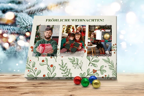 Einen Adventskalender personalisieren ist genau so leicht wie 24 Türchen öffnen: Wähle dein Lieblingsfoto aus, entscheide dich für eines von 9 Designs im Weihnachtsstil und schon ist dein Weihnachtskalender bereit, dir oder deinen Liebsten die Vorweihnachtszeit zu versüßen. So wird der Weihnachtscountdown zu einem täglichen Genuss, der nicht nur den Gaumen, sondern auch das Herz erfreut.